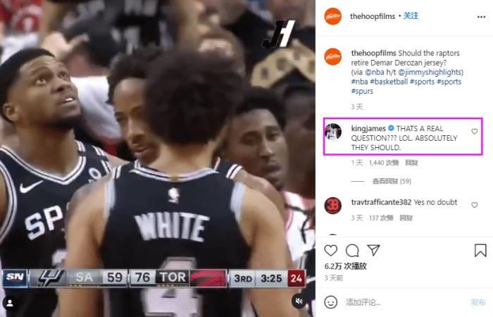 24直播网9月06日讯 近日,美媒体thehoopfilms晒出德罗赞身披马刺球衣隔扣猛龙球员的精彩一幕,配文发问:猛龙应该退役德罗赞的球衣吗?对此,湖人巨星勒布朗-詹姆斯回应:这能算个真正的问题吗?哈哈哈,他们当然应该(退役德罗赞的球衣)。