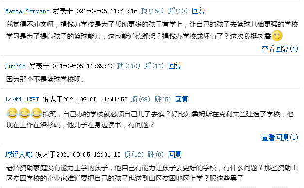 网友的意思比较直白,詹姆斯捐钱办学校是给那些家庭没有能力上学的孩子,而詹姆斯的儿子需要去篮球名校,所以根本没有任何冲突,而且不可能詹姆斯自己办了学校,就非要自己的儿子也去自己办的学校念书,这也是詹姆斯选择在生涯晚年前往洛杉矶打球的原因,詹姆斯希望给到自己的孩子更好的篮球教育。