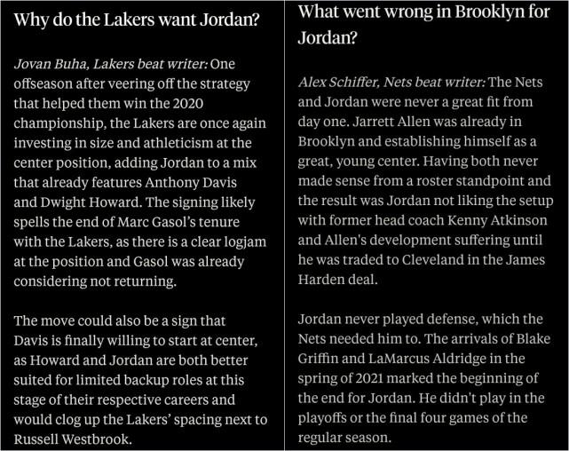 Jovan Buha表示,签下小乔丹可能意味着小加索尔的湖人生涯已经结束——小加索尔已经在考虑不再回到湖人。此外,这也可能是浓眉愿意打中锋的一个信号,因为霍华德和小乔丹在职业生涯的这个阶段,更适合担任替补,他们在场上无法给威少拉开空间。
