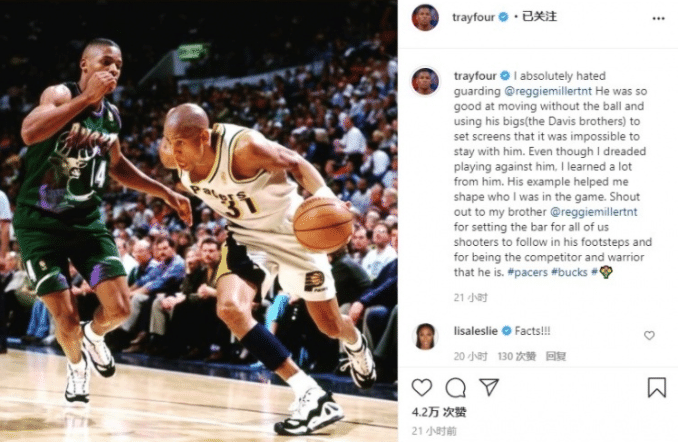 雷阿伦在社媒上晒出了他曾经和米勒对位的照片,配文向米勒致敬,同时表态米勒为所有的射手设定标准,直言米勒是斗士和勇士。米勒在NBA留下了“米勒时刻”的经典故事,可以说不落后“麦迪时刻”,可惜米勒的影响力不如麦迪,同样是无冕之王,但米勒的历史地位并不比麦迪差,这就是雷阿伦致敬米勒的原因,并且生存于乔丹建立王朝的时代,麦迪用三分球对乔丹给出了新时代射手的最强回应。