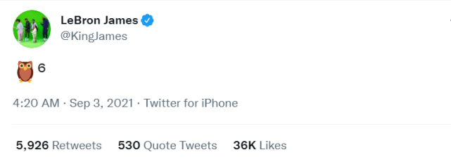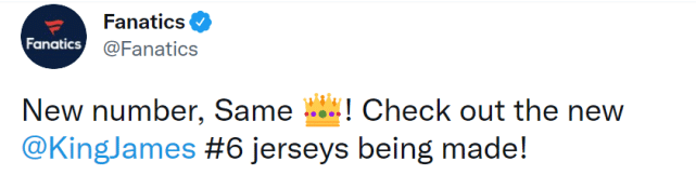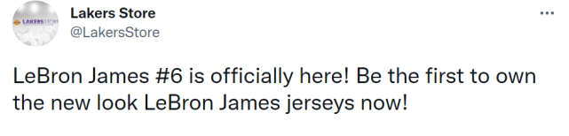 詹姆斯本人在社媒上写道:“(猫头鹰表情)6号。”在球衣开售时提到6号,似乎也是提醒球迷们去购买他的6号球衣。一直以来,詹姆斯在训练中都习惯穿6号,如今,他将在新赛季的正式比赛中也穿上6号球衣。