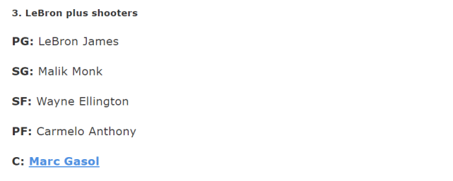 众所皆知,詹姆斯+射手群是经过验证的冠军公式。这个类型的阵容在热火和骑士时期都奏效过,新赛季的湖人也可以摆出这样的阵容。威少和浓眉休息的时段,詹姆斯改打控卫,配上队内各位置的神投手。埃灵顿、蒙克、安东尼和小加,都是上赛季三分命中率四成左右的球员,现在唯一不确定的是小加。如果他不能在新赛季回归,湖人这套阵容就需要继续调整。