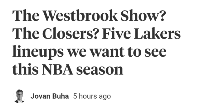 24直播网9月03日讯 ,湖人跟队记者Jovan Buha对球队现有球员进行解析,列出了五套可能在新赛季派上大用场的轮换阵容。这五套阵容适用于不同的时段和状况,也体现了目前这支湖人强悍的阵容深度。