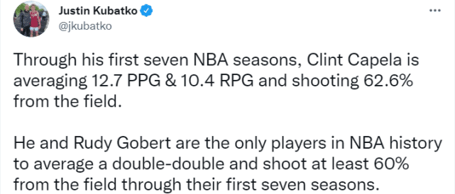 生涯前7年,卡佩拉场均12.7分10.4篮板,投篮命中率62.6%,他和爵士的戈贝尔是联盟历史上在前7个赛季仅有的两位能同时满足场均两双且命中率至少60%的球员。
