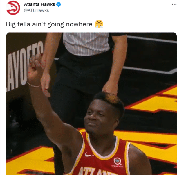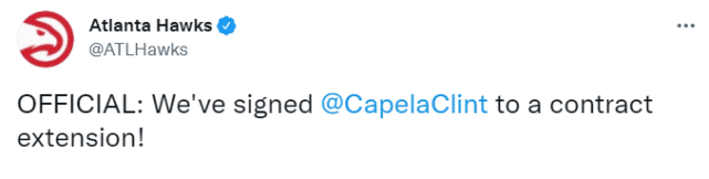 “克林特(卡佩拉)是联盟里顶尖的防守球员和篮板手,他在内线的存在感,以及防守端的表现是我们上赛季取得成功的关键,”老鹰篮球运营总裁施伦克说道,“他是一个能树立榜样作用的队友,我们很兴奋能够让他长期成为球队的一部分。”