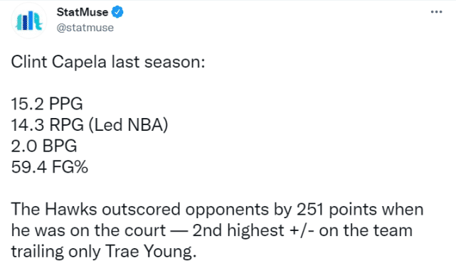 数据网站StatMuse给出了卡佩拉上赛季的数据:场均15.2分14.3篮板2盖帽,投篮命中率59.4%。其中,14.3篮板排名联盟第一。当卡佩拉在场时,老鹰赢了对手251分,这一正负值在队内排名第二,仅次于特雷-杨。