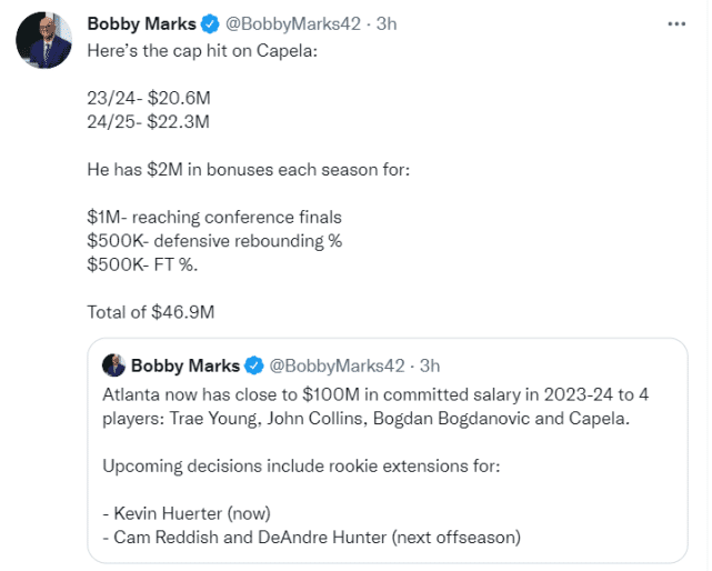 随着卡佩拉的提前续约,老鹰已经将队内4位核心(特雷-杨、科林斯、博格达诺维奇和卡佩拉)至少一起留到2023-24赛季。接下来,他们要决定是否续约年轻人:赫尔特(现在)、雷迪什和亨特(明年休赛期)。