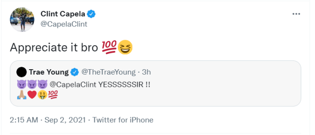 卡佩拉在个人社媒上也宣布了续约老鹰的消息,还晒出了自己的最新训练照。队友特雷-杨发推祝贺卡佩拉:“太棒了!”卡佩拉也回复杨:“谢谢兄弟!”前队友哈登也第一时间为卡佩拉点赞,两人曾一起效力火箭多年,结下了深厚的友谊。沃尔、戈贝尔等NBA球员也点赞卡佩拉续约的消息。