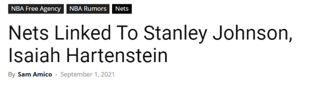 24直播网9月02日讯 ,据美媒最新报道,篮网的两大引援目标曝光。球队有兴趣和自由球员斯坦利-约翰逊签约,也有可能考虑哈登的火箭前队友哈尔滕斯坦恩。