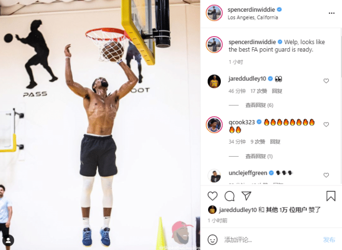 丁威迪更新动态,湖人老将杜德利第一时间点赞,并且在评论区留下一个双眼的表情。