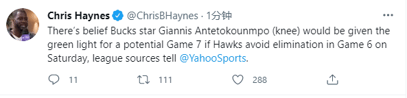 此前老鹰宣布特雷-杨出战成疑,名记更是直言特雷-杨伤势明显好转,预计可以出战东决G6;若雄鹿G6客场输球,系列赛3-3平打进抢七大战,那么字母哥将提前带伤复出。