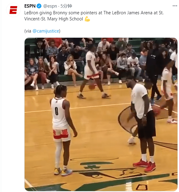 36岁詹姆斯身穿黑色短裤和白色T恤,搭配红色球鞋出镜,还戴着黑色头巾;时隔多年,詹姆斯重返高中母校,看着两个儿子在场上打比赛,恐怕满脑子都是自己年轻时的影子。