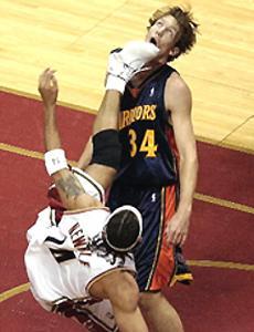 伊拉纽贝尔,很多球迷或许不清楚这哥们到底是谁?伊拉出生于1975年,希腊人,身高203公分,体重100公斤,这哥们整个NBA生涯场均得分5.1分、2.9篮板,几乎是一个可以忽略不计的小角色。他整个生涯最为出彩的瞬间还不是因为自己的表现,而是在比赛中对于邓利维的飞踹,可是就是这样的小人物竟然也有异想天开的时候。