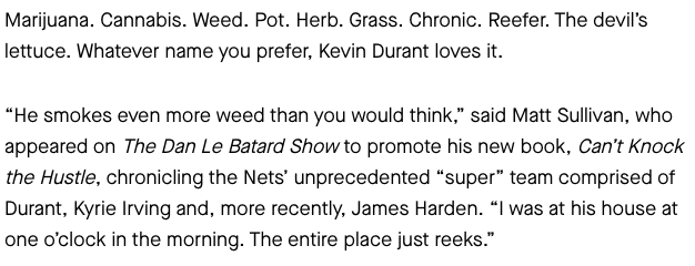 杜兰特真的痴迷这个东西吗?事实上,此前杜兰特就被多次爆出类似的新闻,MATT也解释,杜兰特没有女朋友,不会去疯狂度假,他的生活除了篮球之外,他真的很无聊,所以他选择了这样的消遣方式。值得一提的是杜兰特还曾经公开发声支持这东西的合法化。