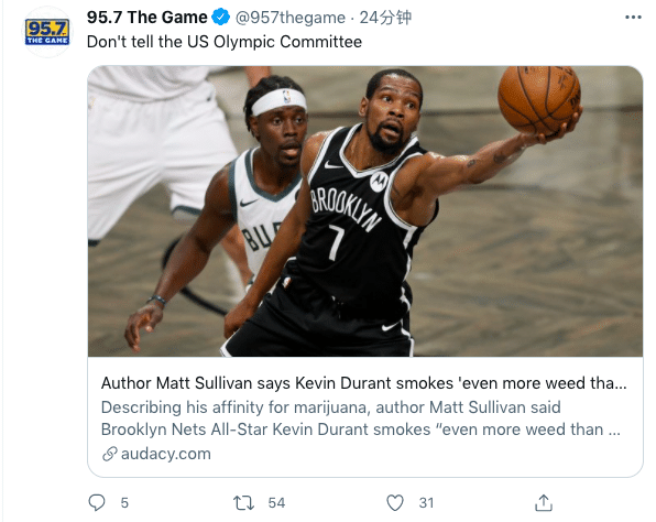 根据金州媒体湾区体育电视台THE GAME报道,杜兰特在日常生活中酷爱大麻,这或将成为杜兰特参加奥运会的阻碍。