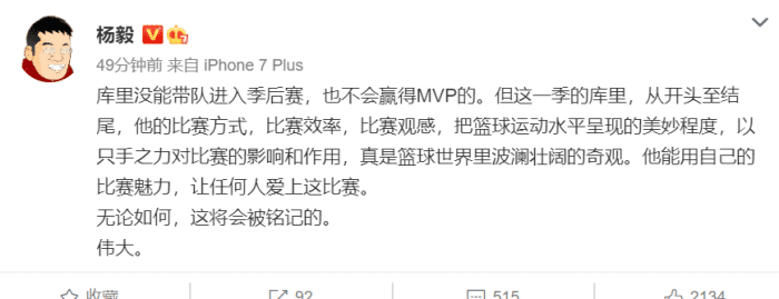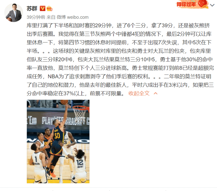 不过比赛输了,杨毅和苏群还是高度称赞了本赛季库里的表现,当然了这也没错,不能因为没杀入季后赛就否定库里本赛季的高光表现!从个人角度来说库里打出了生涯最好的表现,各种疯狂的三分和纪录,也正是因为如此,让他在球队战绩不佳的情况下仍然占据一个MVP候选的位置,一个很明显的事实就是如果他不打,勇士比赛几乎没人看!