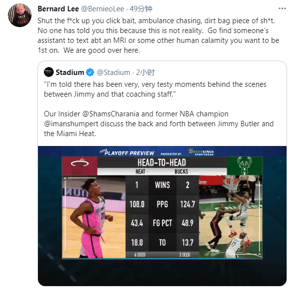 巴特勒经纪人Bernard Lee强势回应名记:闭上你的臭嘴,你个浑水摸鱼的,就是个垃圾;没有人告诉过你这件事,因为这不是事实,我们在这里过得很好。