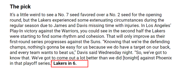 官网直言,在一轮系列赛里,7号种子比2号种子更被看好,确实有点奇怪。詹姆斯表示:“湖人是上赛季的总冠军,因此每支球队都想击败我们,我们得知道这一点,对太阳的系列赛我们要打得比现在更好一些。”官网预测湖人6战胜出。