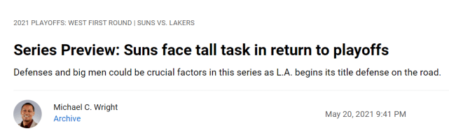 24直播网讯 北京时间5月21日,NBA官网对湖人太阳的这轮西部季后赛进行前瞻和预测,认为双方将大战6场,最终湖人会以4-2的总比分晋级西部半决赛。在解析这轮系列赛时,官网列出了三大看点——