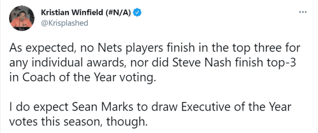 篮网记者Winfield写道:“和预计中一样,篮网没有球员进入任何一个奖项的前三,纳什也没进入最佳主教练奖项的前三,尽管如此,我预计肖恩-马克斯会得到最佳总经理的票数。”就像Winfield说的那样,无人上榜的篮网,或许另有收获,打造这样一支超级球队,马克斯理应得到褒奖。当然,他们最渴望的收获还是一座金灿灿的总冠军奖杯。