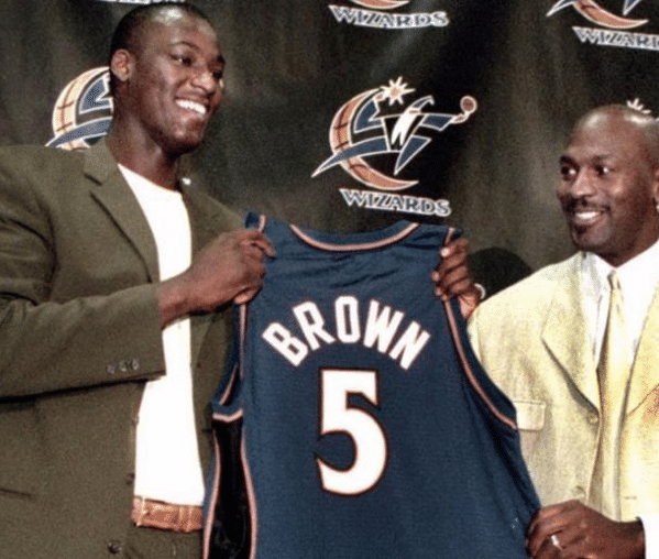夸梅布朗是2001的状元选秀。当年选秀时,夸梅布朗意气风发地走到乔丹面前说“选择我,我不会让你失望的!”看到如此有自信且天赋出众的孩子,乔丹便代表奇才义无反顾地选择了夸梅布朗。夸梅布朗身高2.11m,体重122公斤。因为身强体壮且富有爆发力,夸梅布朗被很多球迷寄予了厚望。但他在场上的表现却让人大跌眼镜。因为夸梅布朗没有中距离,所以他经常会选择在内线完成进攻。但有上空篮的机会他又莫名其妙地上丢了。乔丹本身对队友要求严格。夸梅布朗的这一系列低级失误,直接引起乔丹劈头盖脸的一顿指责。久而久之,球队便减少了夸梅布朗的上场时间。