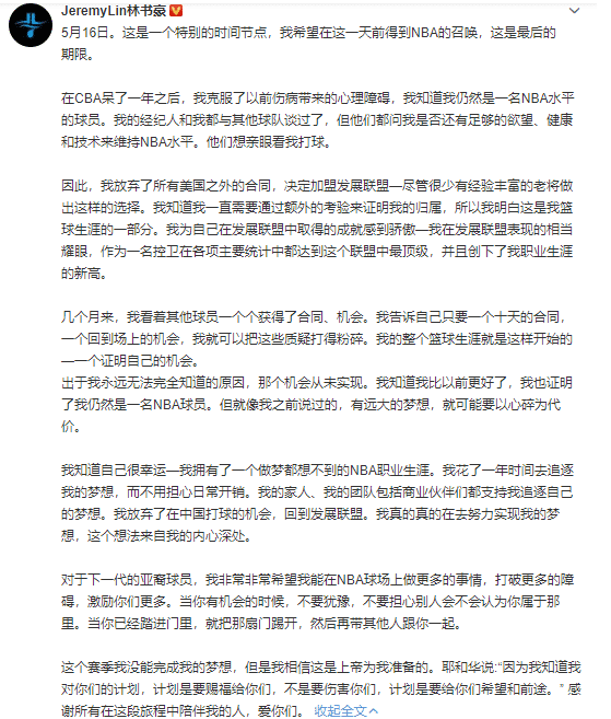 24直播网讯 今天林书豪在社交媒体上的一篇长文吸引了很多人的关注,称自己为了重返NBA,放弃了美国之外的一切合同,而且在发展联盟也打出了不俗的表现,自己只是需要一个证明的机会,哪怕是10天的短合同,一直到常规赛结束,都没有能够实现,林书豪不解为何无法重返NBA。正如他说到的一样,自己的表现比以往更好了,却依旧和NBA无缘了。最后林书豪也感谢了自己在冲击梦想时期一路陪伴的人。