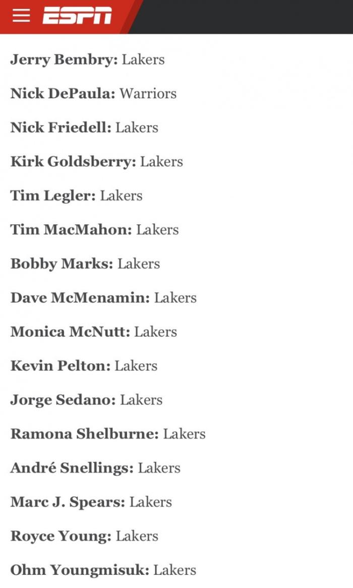 ESPN16位专家仅仅只有Nick Depaula预测勇士赢球,其他15人全都预测湖人赢球,湖人对勇士的预测结果是15-1,几乎全部专家都认为湖人能赢球;这16位专家还预测其他场次的附加赛对决,奇才12-4凯尔特人步行者10-6黄蜂以及灰熊13-3马刺