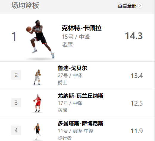 卡佩拉场均14.3个篮板,力压戈贝尔13.4个和瓦兰12.5个。上个赛季中期来到老鹰的卡皇表现抢眼,他也是老鹰本赛季崛起、拿到结束门票的关键。值得一提的是在篮板王的数据上,卡佩拉可以说是领先了一整个赛季,所以篮板王属于这位前火箭“饼皇”堪称实至名归。