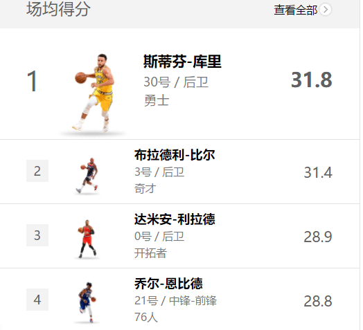 24直播网讯距离NBA常规赛结束只剩下3天的时间了,联盟30支球队也都只剩下1-2场比赛了。常规赛行将结束,本赛季数据王也接近出炉,翻看下数据榜单,其实各个单项数据王已经没有太多的悬念,比尔将继续缺阵,库里接近锁定得分王。巴特勒、特纳和卡佩拉也都有斩获。PS:球员必须满足常规赛出场70%,本赛季也就是得达到51场,才有评选标准。