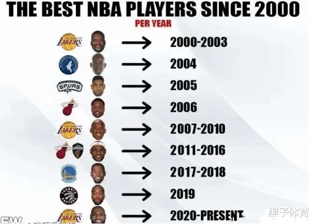 2000-2003年第一人都是奥尼尔;2004年加内特;2005年邓肯;2006年韦德;2007-2010年科比;2011-2016年詹姆斯;2017-2018年杜兰特;2019年小卡;2020年詹姆斯。