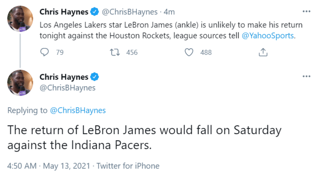 在詹姆斯更新社媒前几分钟,名记克里斯-海耶斯就更新社媒,表示消息源透露,詹姆斯不大可能出战火箭,预计在下一场对阵步行者的比赛中复出。很快,詹姆斯本人就确认了这一消息,36岁巨星继续养伤。由于湖人最后两场比赛也是背靠背,如果詹姆斯在对阵步行者的比赛中复出,他很可能会缺席湖人的最后一场对鹈鹕的比赛。