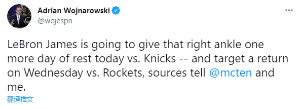 24直播网讯 据ESPN名记沃纳罗斯基报道,詹姆斯因右脚踝扭伤缺席今天湖人尼克斯的比赛,但他计划明日在对阵火箭的比赛中复出;湖人冲击西部第六的利好,浓眉已经找回状态,詹姆斯也即将复出,詹眉终于又要合体了。