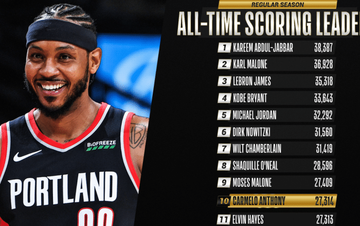 24直播网讯 北京时间5月4日,开拓者客场挑战老鹰,在这场比赛前,安东尼生涯总得分距离历史第十的埃尔文海耶斯只有不到10分的差距,甜瓜大概率在今天迎来里程碑!