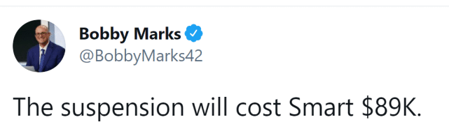 马库斯-斯马特性格一向火爆,他在NBA职业生涯中已经多次因类似事件被罚款。2020年3月,他因与裁判在比赛中发生争执被罚款35000美元,2019年11月,他在赛后批评裁判被罚款15000美元。