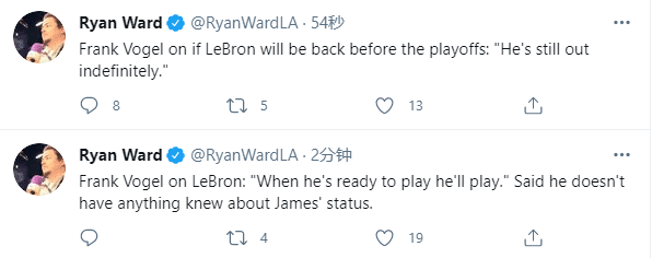 沃格尔表示詹姆斯和队医会告诉他勒布朗什么时刻可以上场;当记者问到詹姆斯是否会在季后赛前复出?沃格尔仍旧回应詹姆斯是无限期休战。