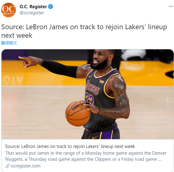 据报道,詹姆斯脚踝伤势康复很好,他有望在一周内重返湖人阵容;接下来湖人的对手依次是国王、猛龙、掘金、快船和开拓者;还有消息爆料,詹姆斯最有可能在下周一对阵猛龙时伤愈复出,医学专家Rajpal Brar转发这一消息,并且写道:刚好是六周,这和我们看到的伤病报告相吻合,詹姆斯在复出的路上。