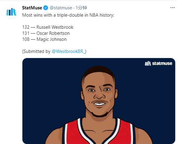 奇才官方狂吹韦少,发推写道:韦少第三次单赛季轰下30+三双,此前在17年和19年,韦少也曾单赛季至少30次三双,韦少成为NBA历史第一位多次单赛季30+三双的球员,NBA上古大神张伯伦和大O都是一次做到。