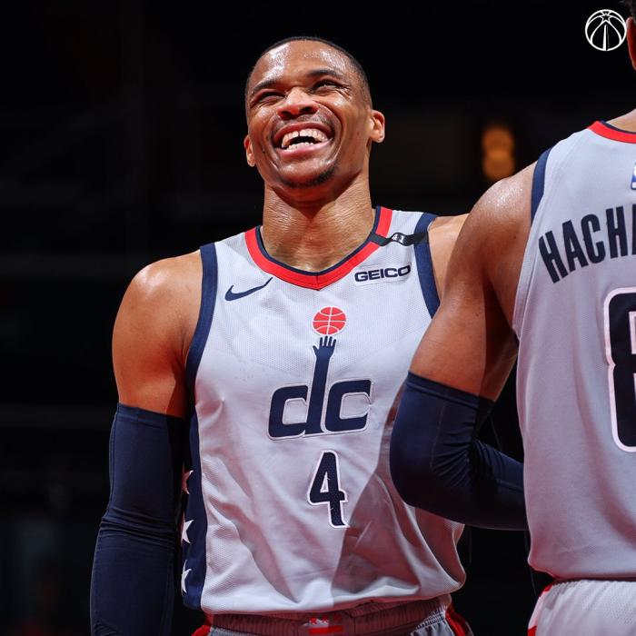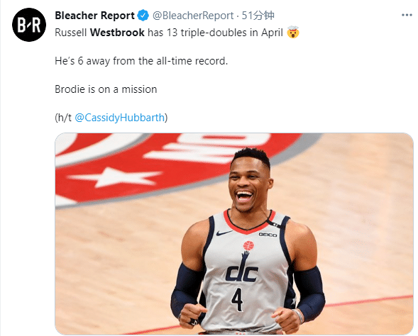 美媒《露天看台》晒韦少咧嘴大笑照,发推写道:韦少在四月拿到13次三双,距离加冕历史三双王仅差6次三双,韦少正在执行任务。