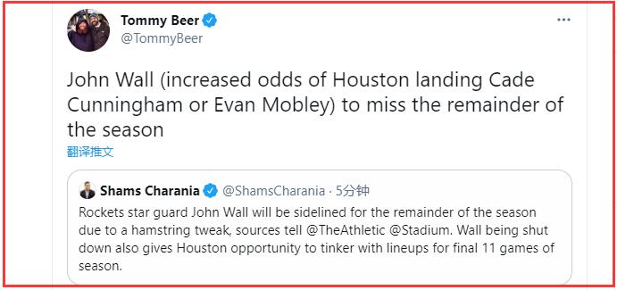 而在沃尔赛季报销的消息传出之后,记者Tommy Beer在社交媒体上发文调侃道:约翰沃尔缺席剩余赛季,提升了火箭选中坎宁安和莫布里的概率!