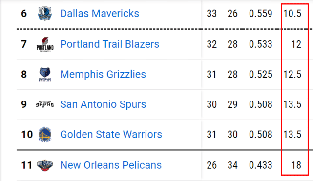 先来看看最新的西部第6-第11位的排名。排在第6的是33胜26负的独行侠,第7-11位的依次是开拓者灰熊马刺、勇士和鹈鹕。鹈鹕和勇士之间已经有4.5个胜场的差距,他们想冲击附加赛希望渺茫。勇士虽然排在第十,但他们和独行侠之间是3个胜场的差距,再结合库里目前的状态,存在理论上的追赶希望。