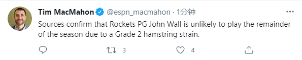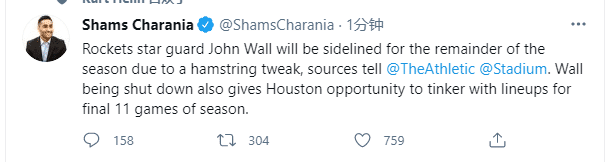 24直播网讯 北京时间4月27日,火箭核心球星约翰-沃尔提前赛季报销,据名记shams报道,火箭后卫沃尔因腿筋拉伤不会出战剩余的比赛,提前赛季报销;随后火箭记者麦克马洪证实,沃尔遭遇腿筋二级拉伤,本赛季不会再为火箭出战。此前篮网球星哈登也是因腿筋伤病而常规赛报销。