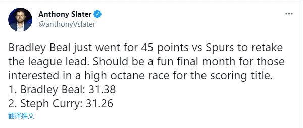 奇才和马刺比赛之后,比尔的场均得分来到31.38分,反超库里夺得得分王,领跑联盟得分榜;目前库里场均31.26分排在得分榜第二位,两人仅仅只差0.12分,这差距微乎其微,不过比尔暂时夺回得分王宝座,压力来到库里这边。