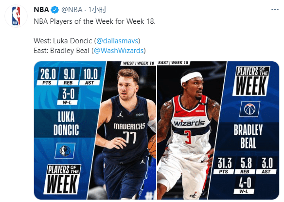 不久前,比尔凭借上一周场均31.3分5.8篮板3助攻的出色表现,当选东部周最佳球员;西部则是东契奇当选,库里遗憾落选。