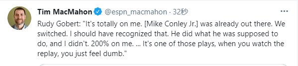 赛后戈贝尔主动担责,他表示自己应该负200%的责任,当你看回放时,你觉得这是一个很愚蠢的错误。