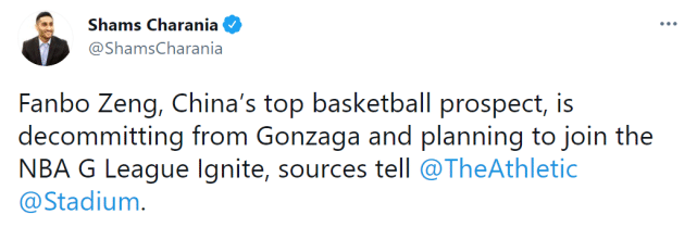 24直播网讯 北京时间4月25日,据The Athletic名记查拉尼亚报道,中国顶级年轻球员曾凡博将不会前往冈萨加大学,而是计划加入NBA发展联盟(G联赛)的点燃队。