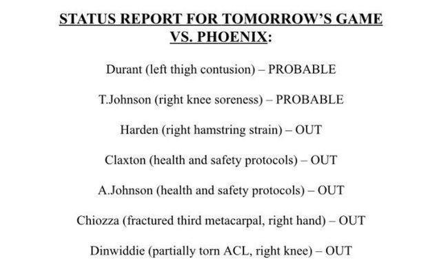 与此同时,另有5名球员已经确定缺席对太阳一战。哈登(右腿筋拉伤)、克拉克斯顿(健康和安全协议)、阿利兹-约翰逊(健康和安全协议)、齐奥扎(右手骨折)、丁威迪(右膝伤病)都无法出战。即便如此,杜兰特和泰勒-约翰逊的回归,还是能让篮网的阵容实力有明显提升。