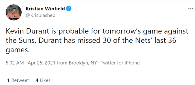 上一场比赛对阵凯尔特人,杜兰特本有希望复出,一度状态提升为QUESTIONABLE(上场可能50%),但最终赛前他还是未能上场。纳什表示,杜兰特尚未100%痊愈,大家还需要一些耐心。现在看来,杜兰特的恢复进展令人满意,篮网官方也再次升级了他的状态。一般来说,如果没有太大的问题,状态列为PROBABLE的球员基本都能上场。