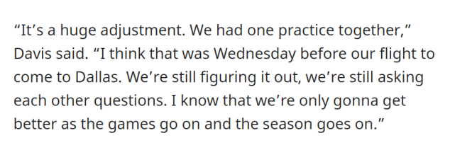 谈到自己和庄神的搭档时,浓眉说:“这是一次重大的调整。我们只在一起进行过一次训练。那应该是我们飞往达拉斯前的时候。我们还在磨合,还在向彼此问问题。我知道随着赛季和比赛的进行,我们会越来越好的。”