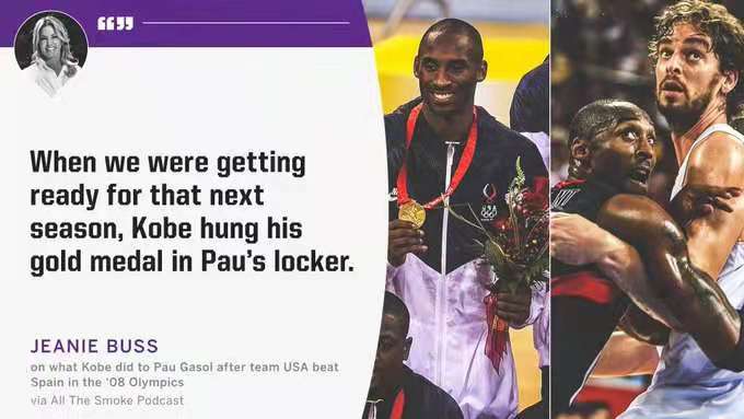 4月25日,湖人队美女老板珍妮巴斯在接受采访的时候曾经说出了一段科比和加索尔的过往,珍妮表示,2008年北京奥运会,科比带领美国男篮击败了加索尔的西班牙男篮获得了冠军。奥运之后,当湖人队开启新赛季的时候,科比特意把他的金牌挂在了加索尔更衣室的柜子里面。珍妮爆料之后大加索尔也转发了相关报道表示:是的,他真的这样做了。