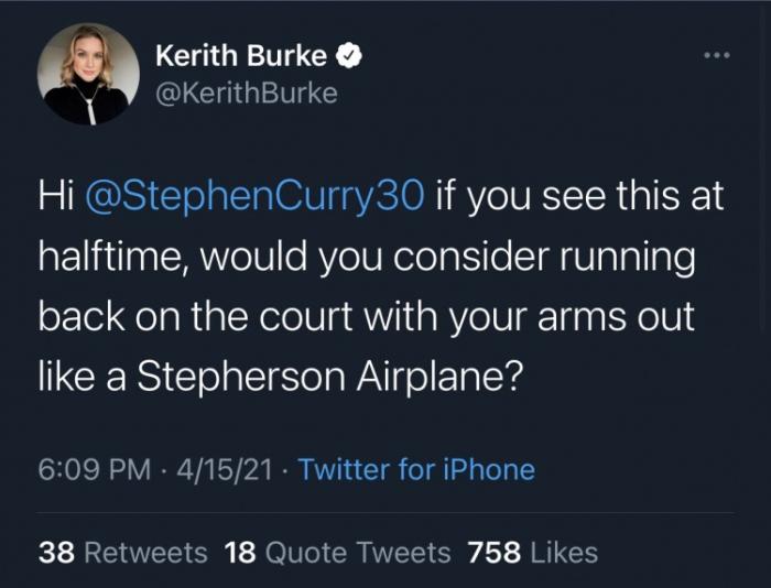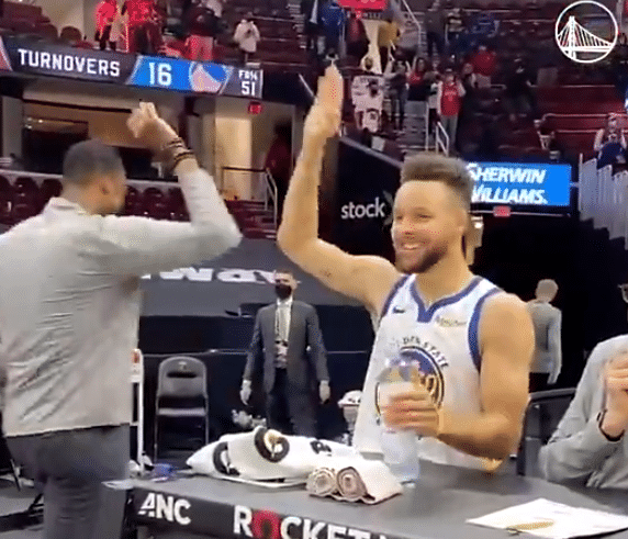 而球队战绩提升库里心情也是非常地好,在场上多次大笑,上一场中场休息偷玩手机的他本场再次中场休息偷玩手机!勇士场边女记者Kerith Burke发推:嗨@库里,如果你在半场看到这条推特,考虑一下下半场回到场上时做一个喷气机的庆祝动作吗?库里在第四节连进三分后果然做了这个动作,看起来他看到了推特。